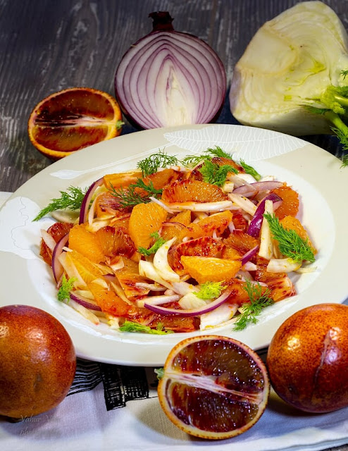 Pane fenkol koos apelsini ja mandariinitükkidega kaussi. Lisa sibul, riivitud tsitruste koored ja maitsesta soola ja pipraga. Väikeses kausis sega kokku salatikastme koostisosad.