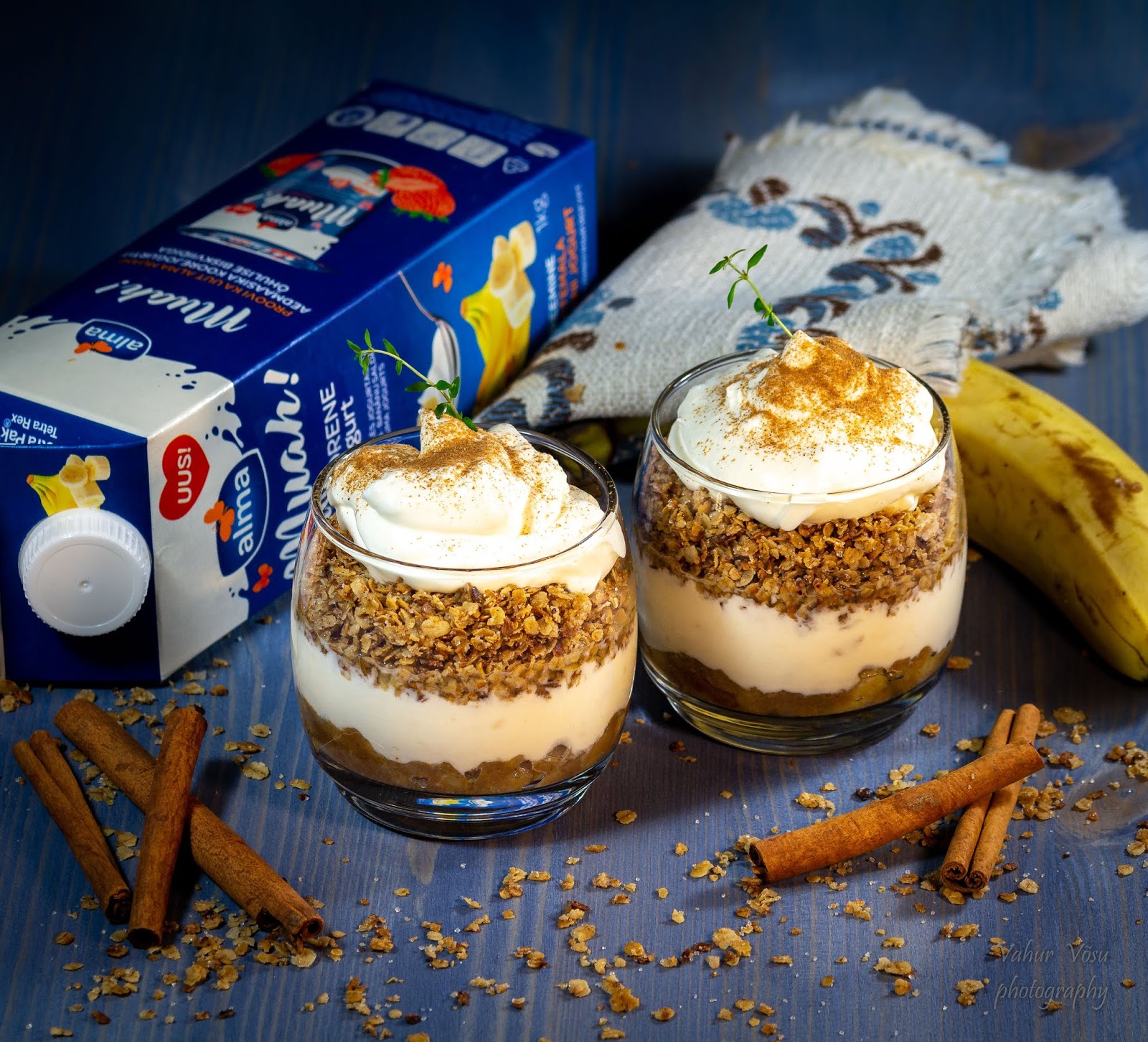 Pane klaasi kiht karamellistatud banaane, lisa jogurt ja kaerahelbed ning kõige peale vahustatud vahukoor. Serveerimisel raputa maiusele kaneeli. Serveeri kohe.