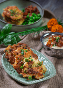 Mõnusad krõbedad koogid, mida sobib hästi serveerida nii hommiku- kui õhtusöögiks. Magusa maitsenüansi annavad roale rohelised herned ja kergelt soolaka varjundi krõbedaks praetud toorsuitsusink.
