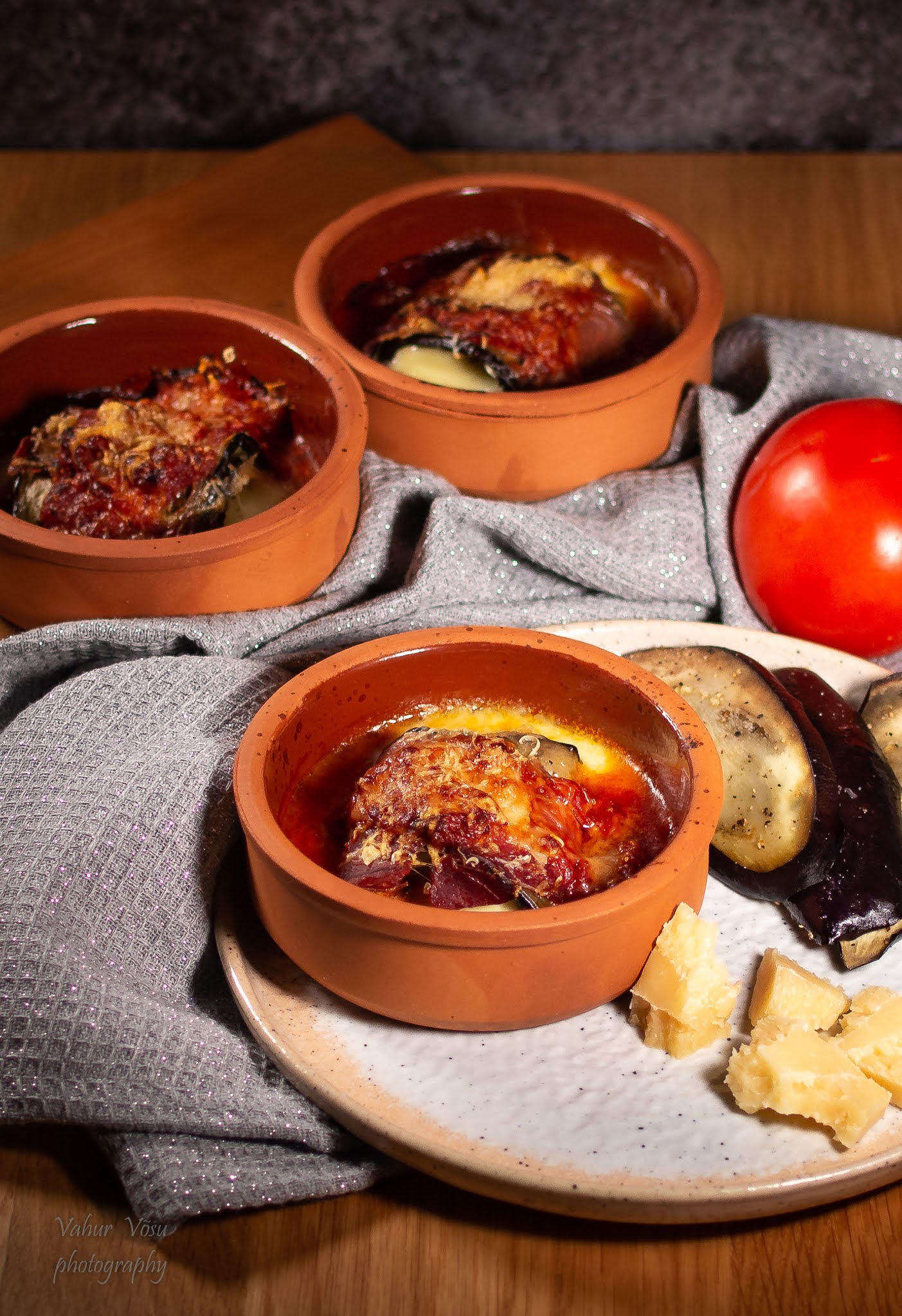 Võta prociutto viil ning aseta sinna baklazaaniviil ja mozzarella viil. Rulli kokku. Pane pannile osa tomatikastmest ning aseta sinna rullid, nii, et sulgemiskoht jääks vastu ahjupanni. Määri rullidele ülejäänud tomatikaste ja puista peale Parmesani juust. Küpseta ahjus 15 minutit.