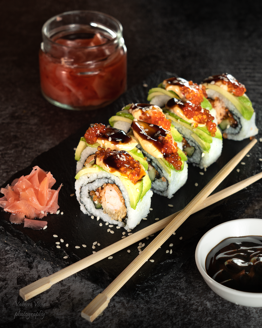 Sushi kaetakse pealt tavalisel tobiko kalamarjaga ning niristatakse rullile võrtsikat majoneesi ja unagi kastet, mis teeb selle sushi veelgi isuäratavamaks.
