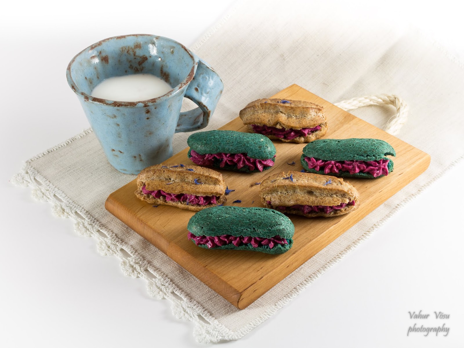 Tuli mõte teha ekleere ja proovida neid küpsetada ainult rukkijahust. Rukis on üks minu lemmiktoorainetest ükskõik mis kujul, kas jahu või helbed. Osadele ekleeritele lisasin ka sinist toiduvärvi, et teha neid huvitavamaks ja Vabariigi aastapäeva snäkkidele kohaselt pidulikuks. Küpsemise käigus muutus värv kergelt rohekas-siniseks. Täidiseks panin seekord soolase juustu- peeditäidise 🙂