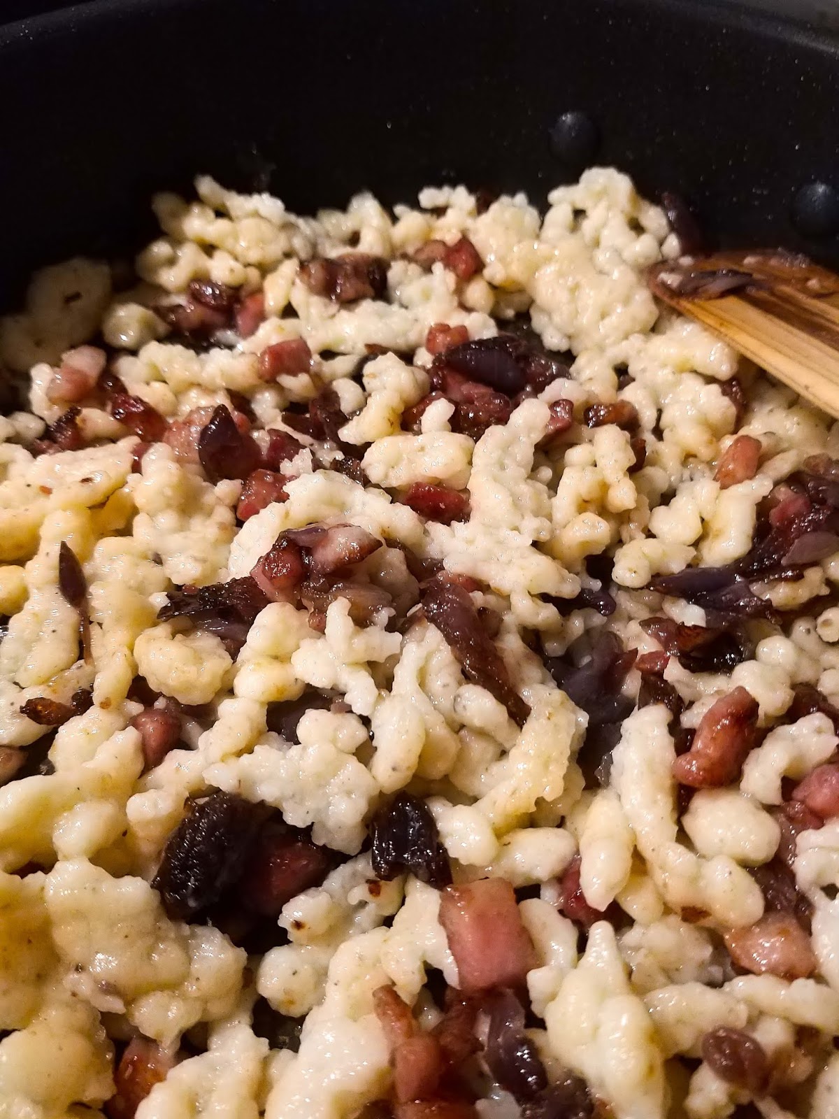 Lase klimpidel keeda 2-3 minutit. Kui need on valmis, siis kurna need läbi sõela ja pane pannile praetud sibula ja pancetta juurde. Sega läbi, et klimbid ei kleepuks kokku.