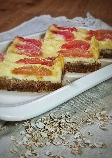 Mõnus karamellise maitsega rabarberikook, mille põhjas on kasutatud rukkihelbeid ja mandlijahu ning fariinsuhkrut,