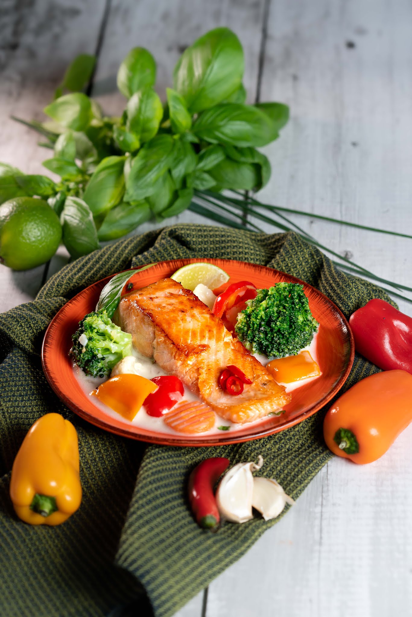 Lisa pannile lõhe, keedetud köögiviljad ja tükeldatud paprika. Kuumuta ca 3 minutit. Serveeri kohe koos tšilli, laimisektoritega ja värske basiilikuga.