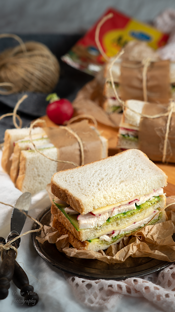 Määri saiaviilule 1 spl pestot. Laota saiale kurgiviilud, rediseviilud ning broilerifileeviilud. Kõige peale pane viil Atleet juustu. Kata juust järgmise saiaviiluga ning korda sama nagu enne. Kata täidis uuesti saiaviiluga ning vajuta kergelt saiaviilu käega, et võileiba pisut kokku suruda. Lõika võileid pikuti pooleks ning mässi ümber võileiva tükike küpsetauspaberit ning seo võileib kinni tükikese nööriga.