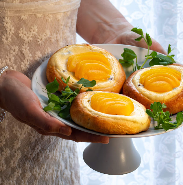 Küpseta ahjus 200 c juures ca 20 minutit. Jahtunud korpidele lisa virsikud ja želee.