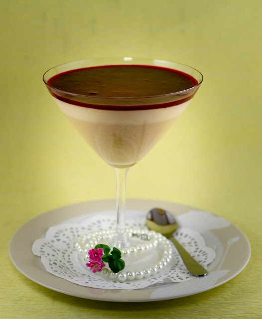 Kohvi ja valge šokolaadimousse, Vana Tallinn Marzipan Cream vahuga ja vaarika kastmega.