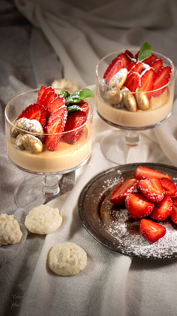 Niisuta suhkur 2 spl veega ja karamellista suhkur. Lisa suhkrule vesi ja keeda sellest siirup. Lisa vahukoor karamellisiirupile. Lase želatiinil vees punduda ja lisa želatiin kuuma koore segusse ning sega kuni želatiin on täielikult sulanud. Kalla saadud segu magustoidupokaalidesse ja lase külmkapis tarduda. Serveeri värskete marjadega.