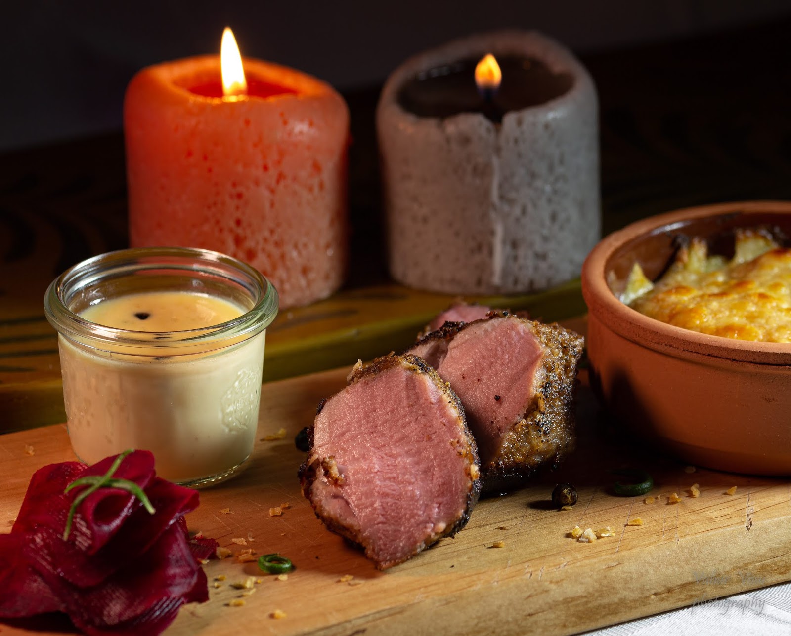 Tegu on sous vide meetodil küpsetatud seasisefileega, mis hiljem on kaetud rukkileivaga ja küpsetatud pannil krõbedaks. Lisandiks on odrakruubi-kartuliahjuvorm juustuga ning mee ja äädikaga marineeritud krõmpsuv toores peet. Kastmeks on koorene kaste praetud sibula, kadakamarjade ja tumeda porter tüüpi õllega.