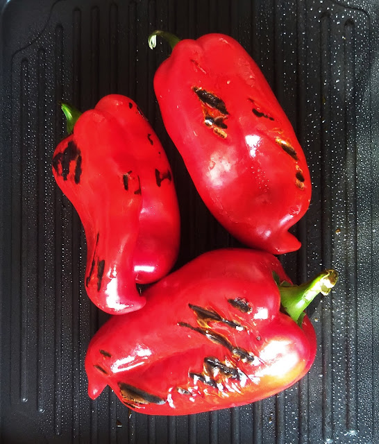 Kuumuta terveid paprikaid grillil pöörates neil erinevat poolt. Vaata, et paprika nahk pruunistuks aga paprika ise ei muutuks pehmeks-lödiseks vaid jääks krõmpsuks. Jahuta ja koori paprikatelt kõrbenud nahk.