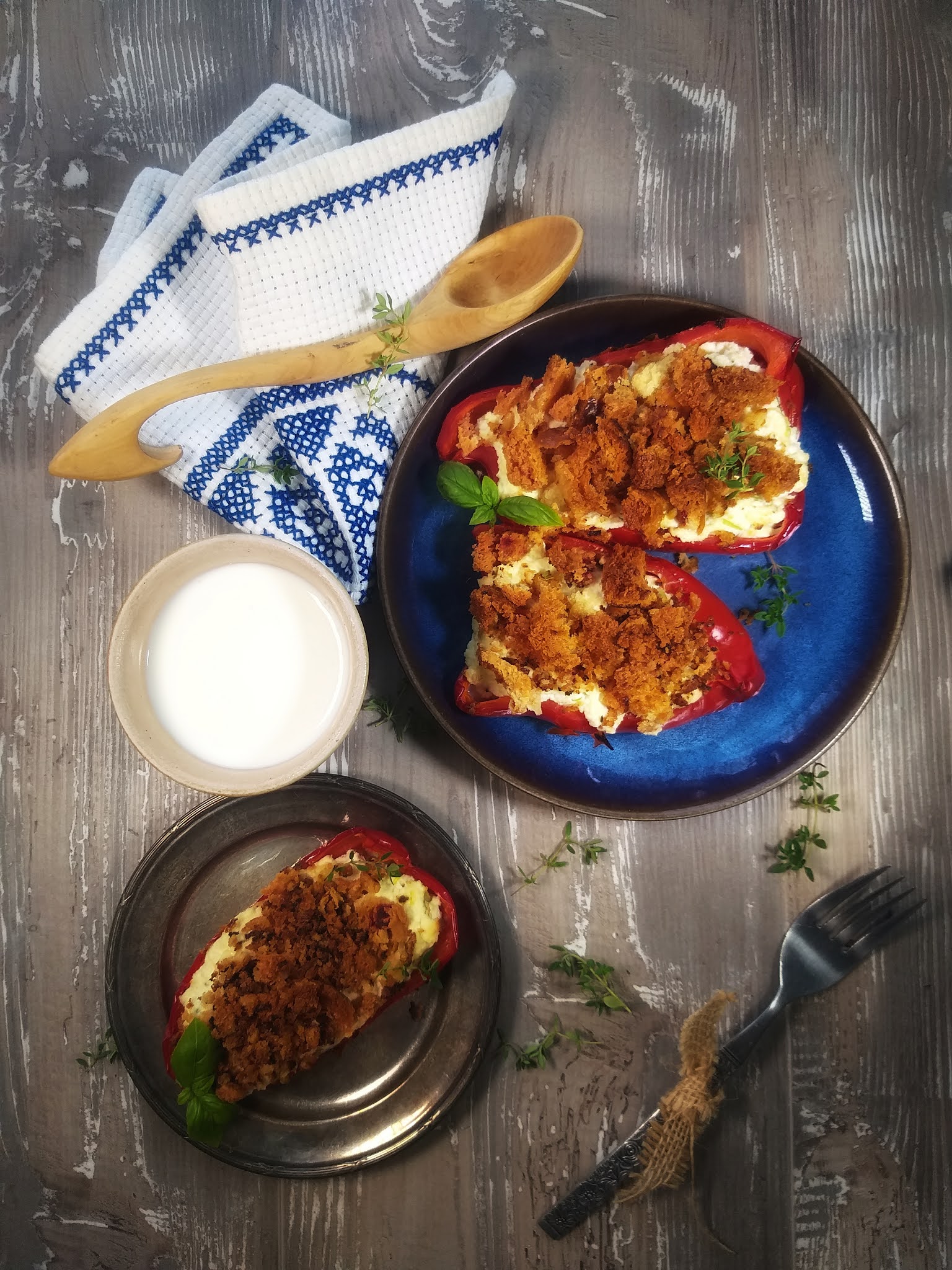 Sega kausis Ricotta, basiilik, rosmariin, tüümian, porru, sool ja pipar. Lisa muna ja juust. Täida paprikad seguga ja raputa peale saiapuru. Küpseta ahjus 30 minutit, kuni täidis on tardunud ja leivapuru pealt pruunikas. Kaunista basiiliku lehtedega.