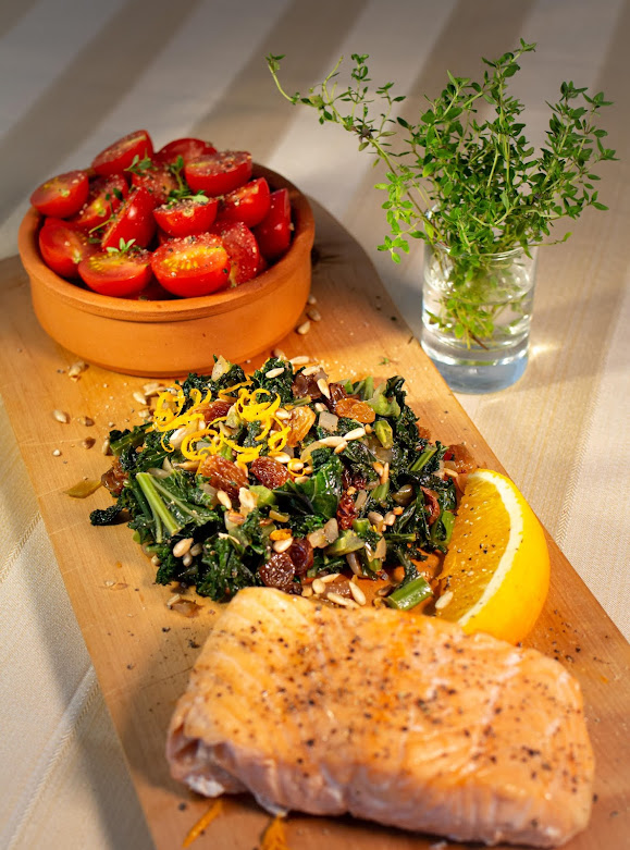 Kuivata pann ja lisa pannile oliivõli. Prae peeneks hakitud sibulat, kuni see on muutunud klaasjaks. Lisa pannile lehtkapsas, rosinad (koos mahlaga), röstitud päevalilleseemned ning apelsini koor. Maitsesta soola ja pipraga. lase haududa mõni minut, et lehtkapsas soojeneks piisavalt. Serveeri kohe koos ahjulõhe ja kirsstomatitega.