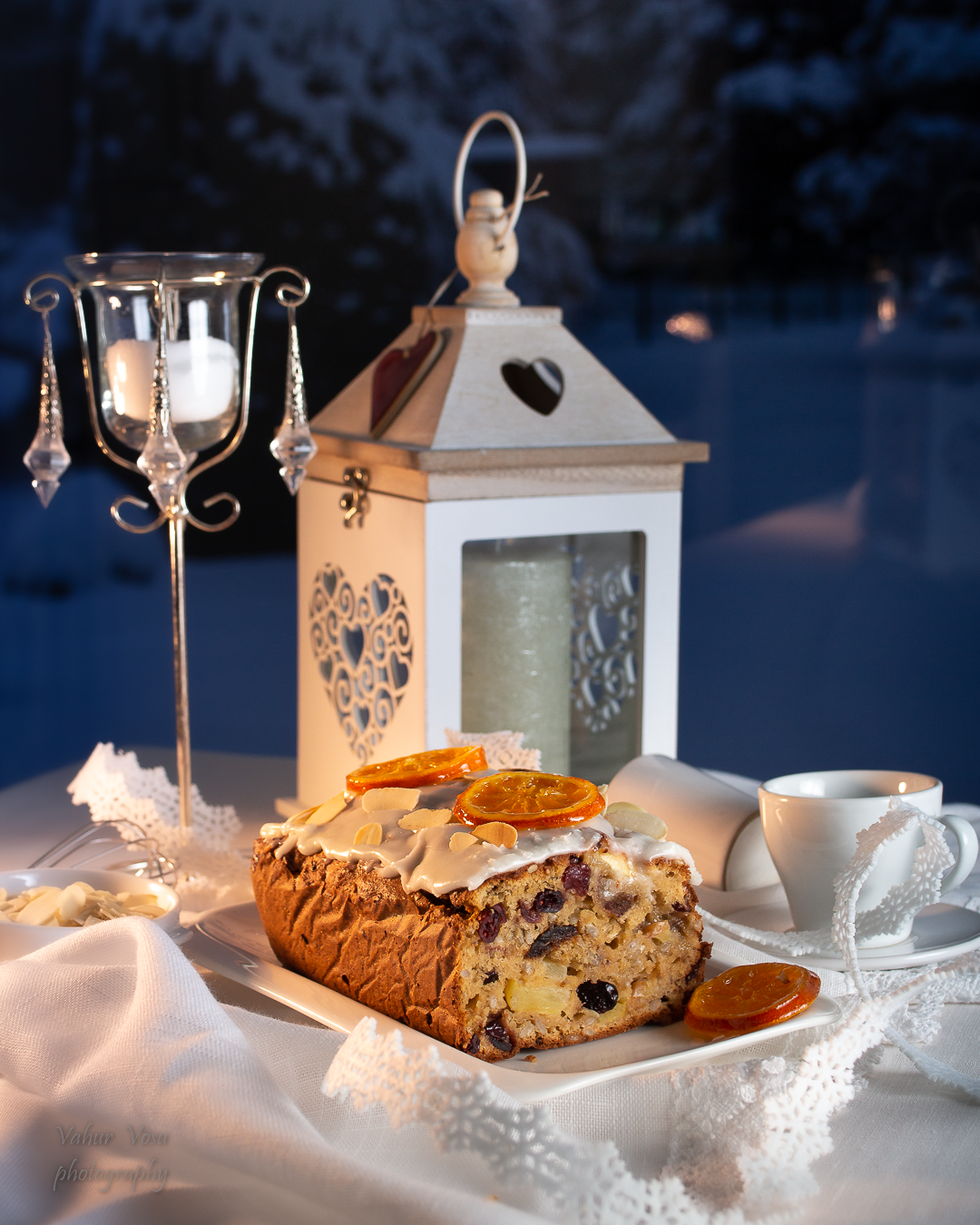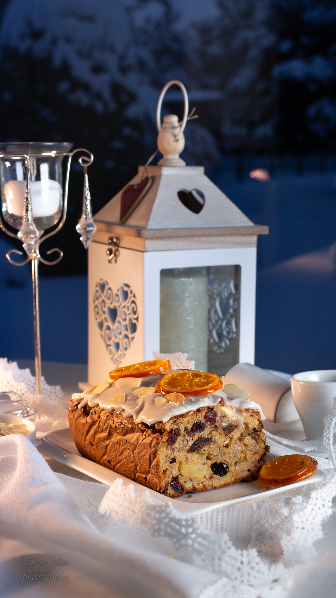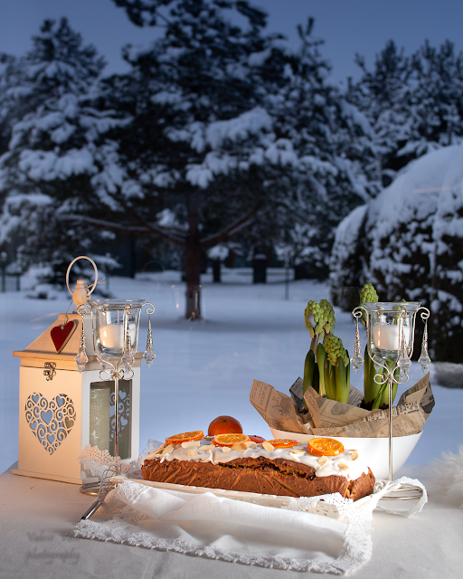Valge suhkruglasuur annab mõnusa valge lumise ilme ning armsa nüansi annavad ka suhkrustatud mandariiniviilud ja röstitud mandlilaastud.