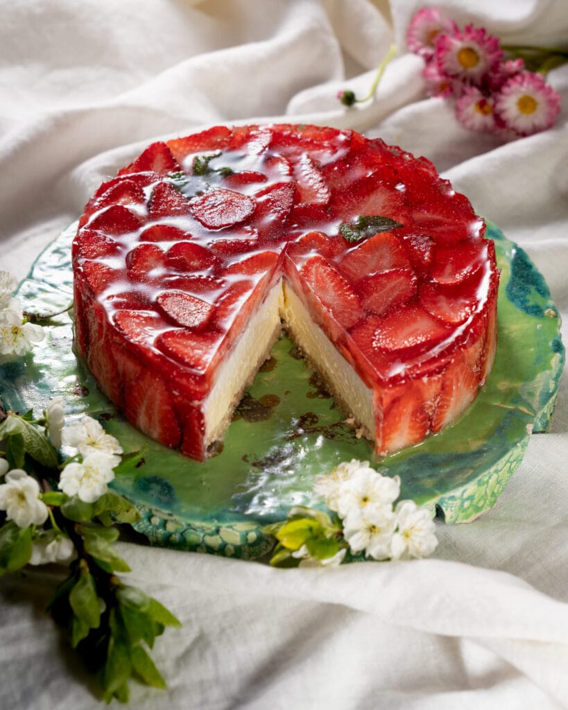 Toorjuustukoogi katsin pealt ning külgedelt maasikatega ning tarretisega.