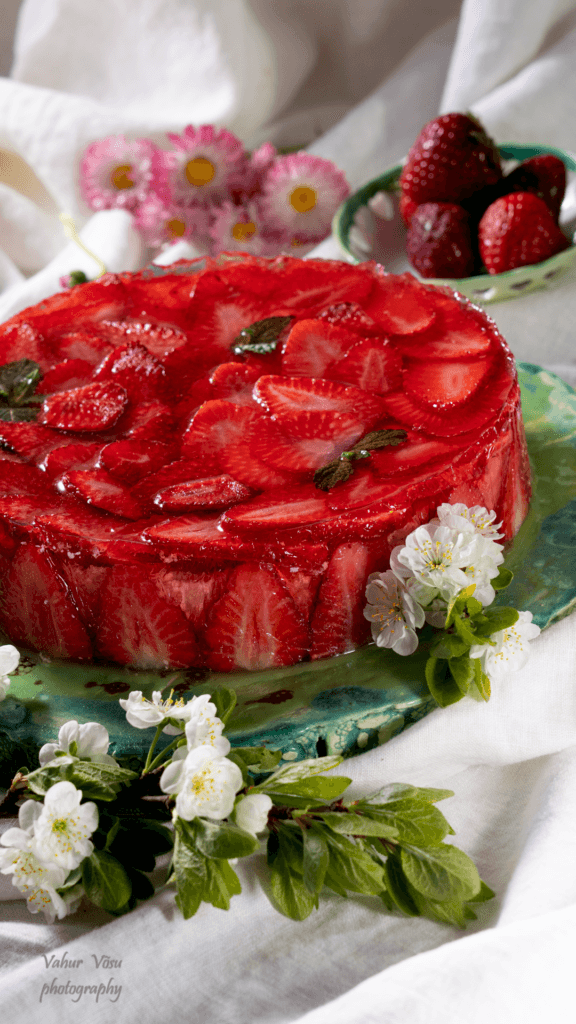 Suvine maasikakook, kus maasikatarretise alla on peidetud Manhattani juustukook.