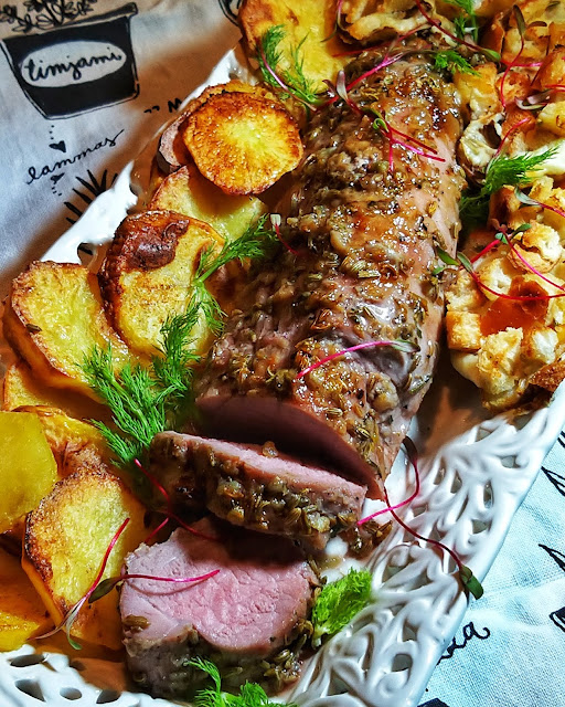 Pane liha küpsetuspaberile ja küspseta kuni liha õrnalt roosakas – see võtab aega ca 20 minutit ning liha sisetemperatuur peaks olema 63 C. Tõsta liha kõrvale ja kata fooliumiga, et liha säiliks soojana.