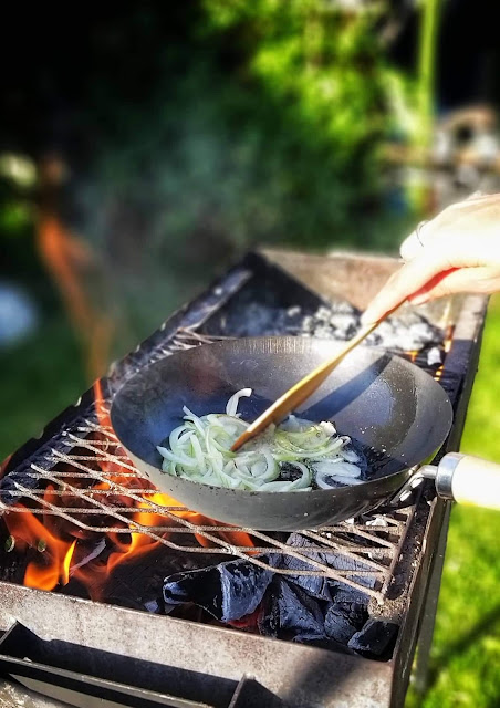 Kuumuta wokipann kõrgel kuumusel. Lisa õli ja keeruta panni, et see kattuks õliga. Lisa sibulad, pruunista need kergelt ja tõsta kõrvale.