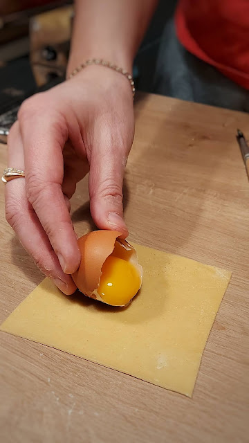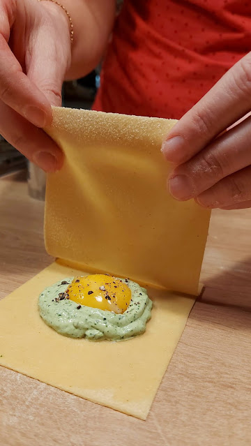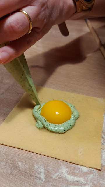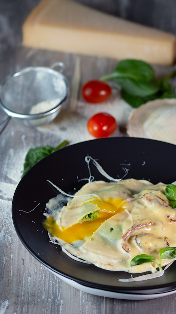 Vormida ravioolid ja keeta neid soolaga maitsestatud vees ca 2 minutit- Munakollane peab jääma vedel. Serveerida koos kastme, riivitud juustu ja basiilikuga.