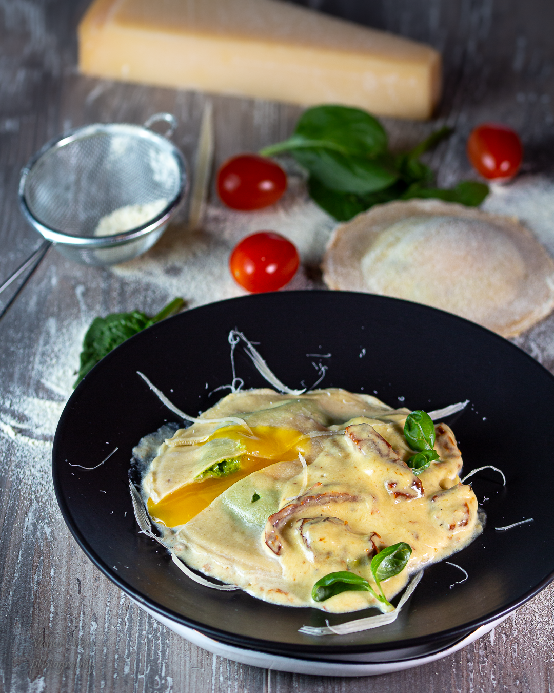 Vormida ravioolid ja keeta neid soolaga maitsestatud vees ca 2 minutit- Munakollane peab jääma vedel. Serveerida koos kastme, riivitud juustu ja basiilikuga.
