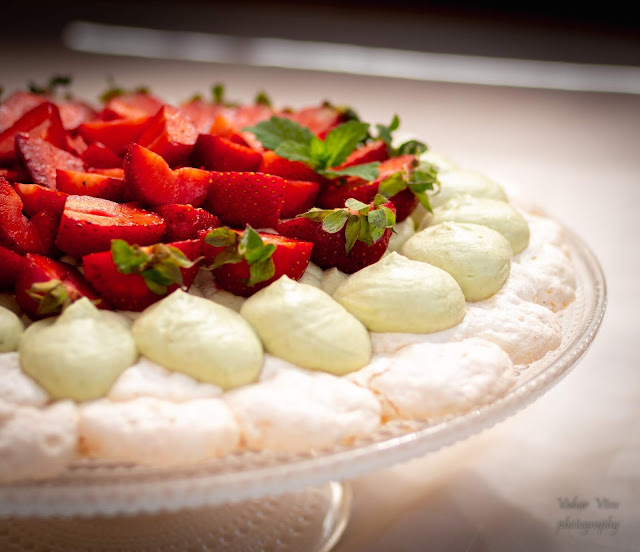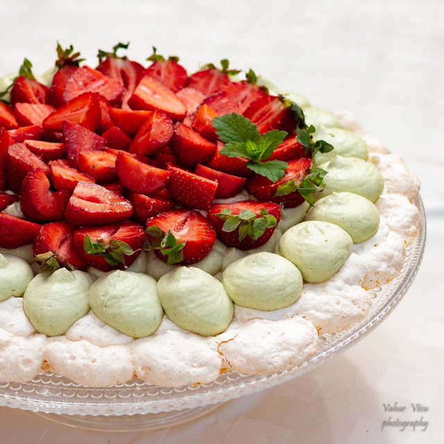 Pähklibesee pistaatsiapähklise vahukoore ja maasikatega