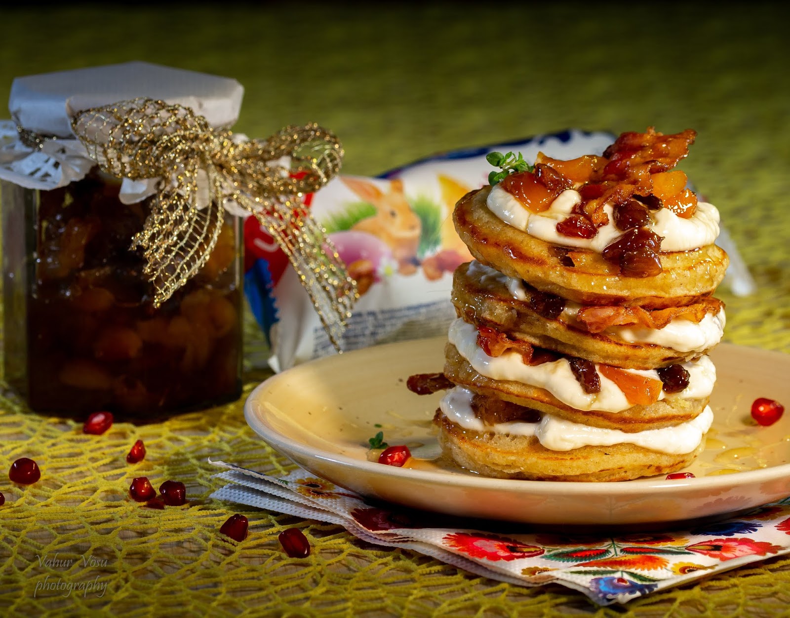 Lihavõttepühade hommikusse sobivad kohupiima pannkoogid mõnusate puuviljadega siirupis ja väikese peekoniga.
