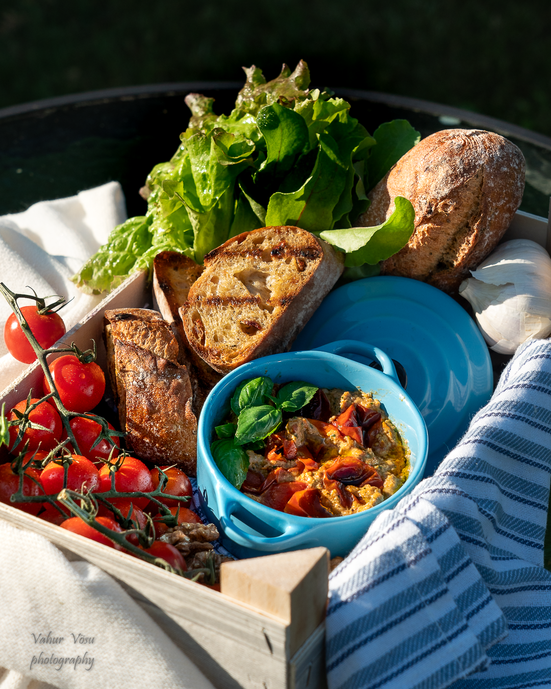 Pane pooleks lõigatud kirsstomatid kaussi ja sega need oliivõliga. Rösti neid ahjupannil 250 C juures ca 15 minutit, kuni need on pehmed ja kergelt pruunikad. Jahuta röstitud tomatid enne kasutamist.