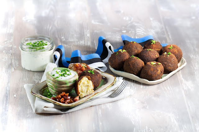 Serveerimiseks prae peekon krõbedaks ning serveeri suupisteid koos krõbeda peekoni ja hapukoore kastmega. Hapukoorekastme valmistamiseks sega hapukoor soolaga ning lisa pisut hakitud murulauku.