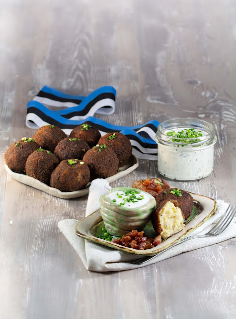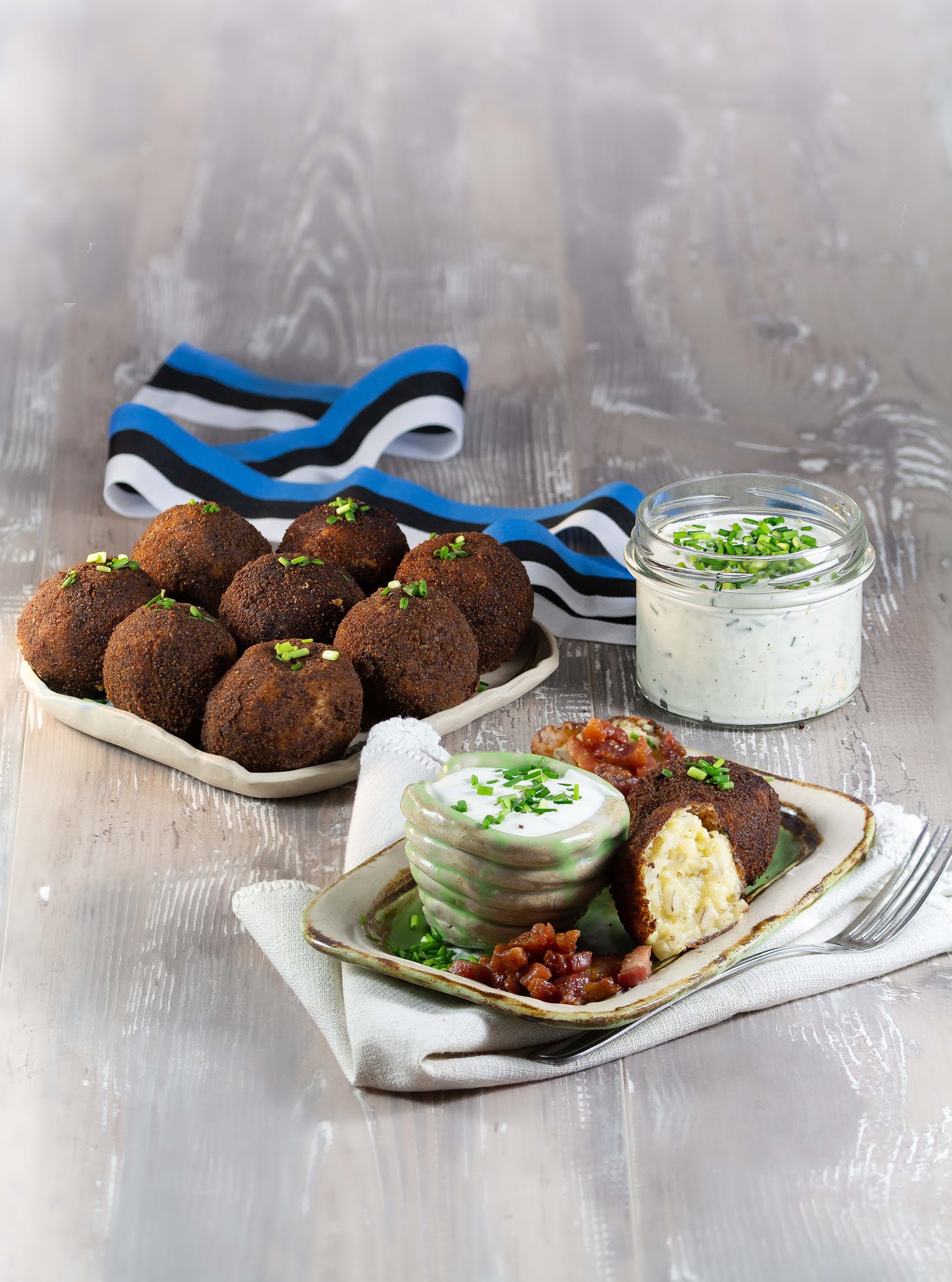 Serveerimiseks prae peekon krõbedaks ning serveeri suupisteid koos krõbeda peekoni ja hapukoore kastmega. Hapukoorekastme valmistamiseks sega hapukoor soolaga ning lisa pisut hakitud murulauku.