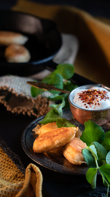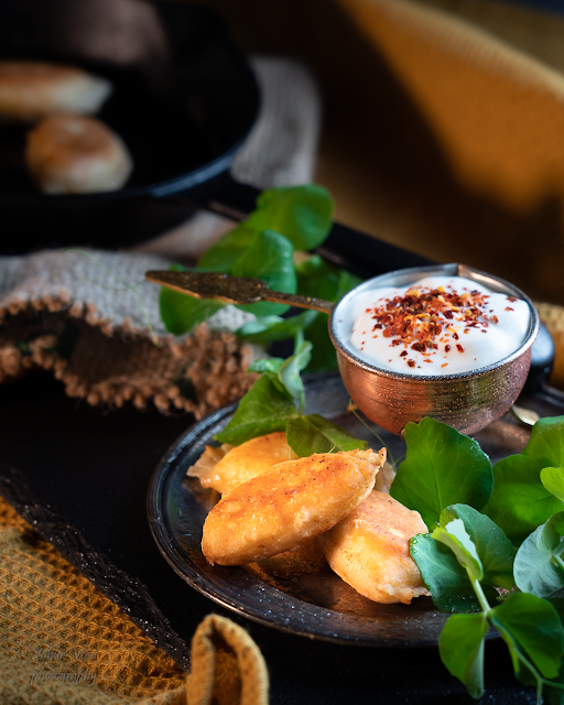 Nendest koostisosadest segatakse kokku rullitav taigen sõtku seda ca 10 minutit kuni tainas on ühtlane), vajadusel lisa veel jahu. Rulli taigen õhukeseks ja lõika välja ca 6 cm ringid. Pane ringi keskele täidis ja murra pirukas poole. Suru pirukaservad kõvasti kinni, et need ei tuleks küpsetamise ajal lahti ja täidis välja. Määri pirukaid pealt munaga. Küpseta pirukaid mõlemalt pool või sees kuni need on kuldpruunid.
