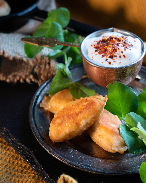 Nendest koostisosadest segatakse kokku rullitav taigen sõtku seda ca 10 minutit kuni tainas on ühtlane), vajadusel lisa veel jahu. Rulli taigen õhukeseks ja lõika välja ca 6 cm ringid. Pane ringi keskele täidis ja murra pirukas poole. Suru pirukaservad kõvasti kinni, et need ei tuleks küpsetamise ajal lahti ja täidis välja. Määri pirukaid pealt munaga. Küpseta pirukaid mõlemalt pool või sees kuni need on kuldpruunid.