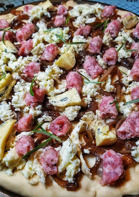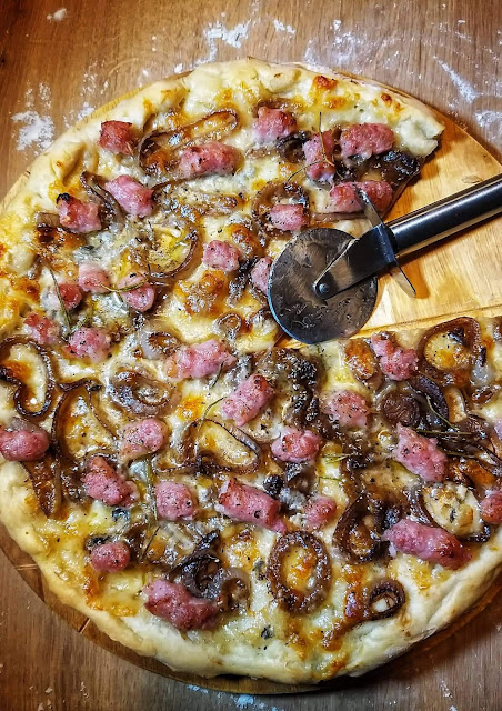 Laota sibul ja juustud pizzale. Koori toorvorstid ja murra neist umbes poole teelusika suurused tükid ning kata nendega pizza. Küpseta ahjus 15 minutit kuni juust hakkab mullitama ja toorvorstid on küpsenud.
