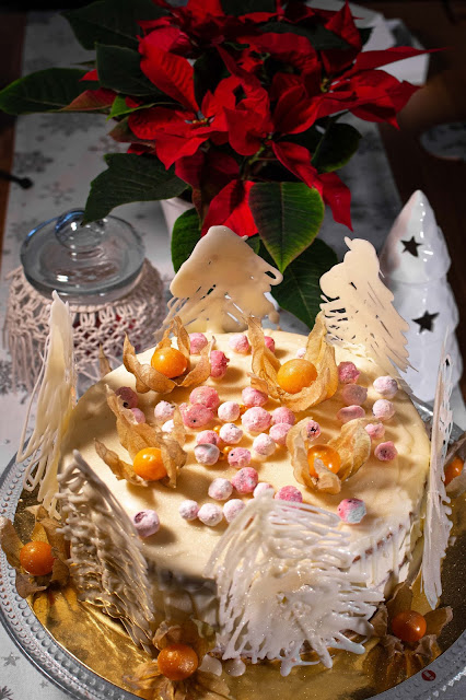 Kaunistuseks valge glasuurist tehtud kuusekesi ning kergelt kuldset sädelust. Suhkruga kaetud jõhvikaid, mis meenutavad lumepalle ning füüsaleid.
