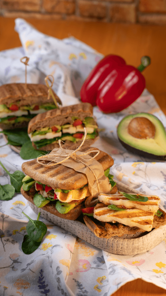 Pane kahele saiaviilule avokaado viilud, halloumi, spinati lehed ja paprika. Nirista  võileivale kaste ning tõsta peale teised saiaviilud. Lõika võileivad pooleks ning serveeri.