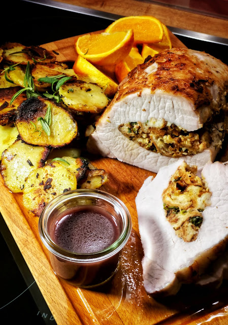 Sega kausis sibul, röstitud saiapuru, juust, rosmariin, küüslauk, basiilikulehed, sidrunikoor, sool ja pipar. Suru segu liha sisse lõigatud taskusse ja seo liha kinni kööginööriga- viiest kohast.