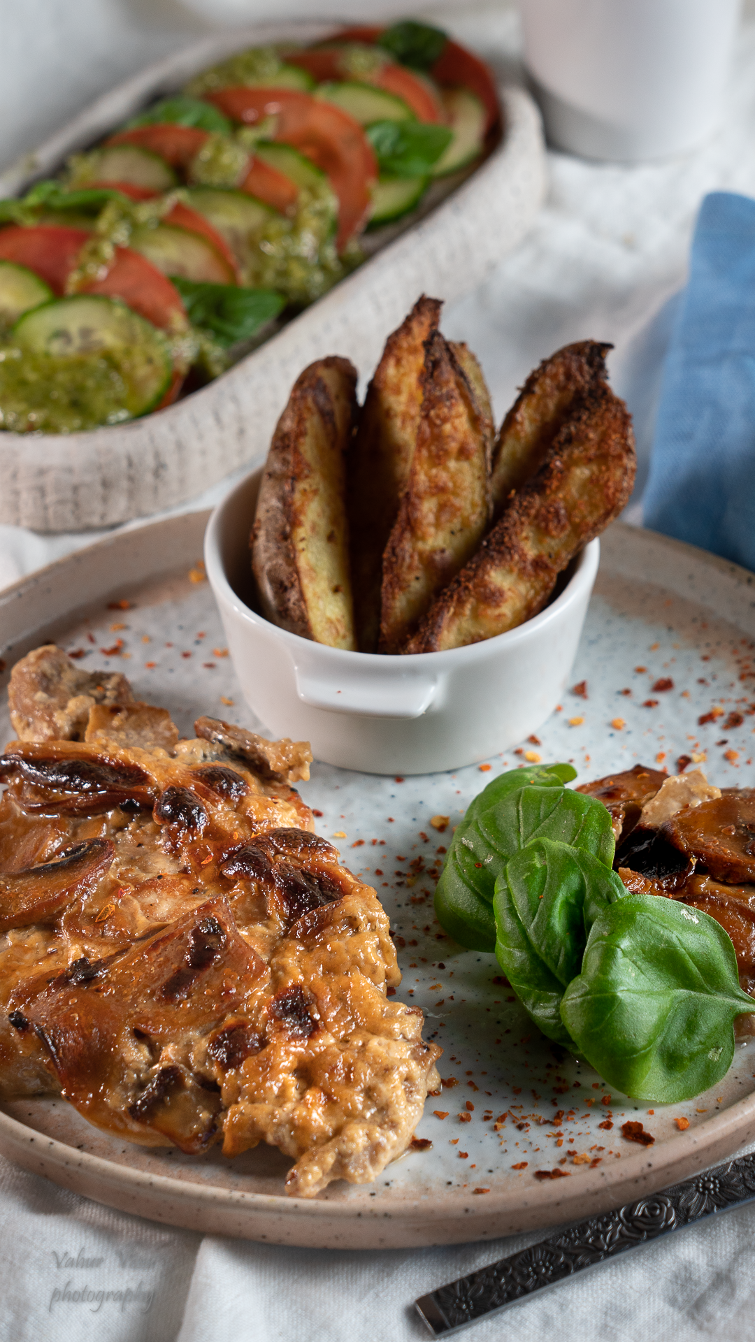 Prae lihatükid pannil kõrgel kuumusel mõlemalt poolt kuldruuniks. Tõsta liha pannilt ja lisa pannile tükeldatud sibul ja küüslauk ning tükeldatud seened. Prae kuni seened on kergelt pruunikad. Lisa pannile koor ning sulajuust. Lase kastmel keema tõusta ja sega kuni sulajuust on täielikult sulanud. Maitsesta kaste soola ja pipraga. Pane liha kihiti ahjuvormi ning kalla neile kaste.