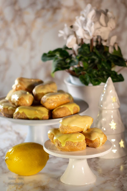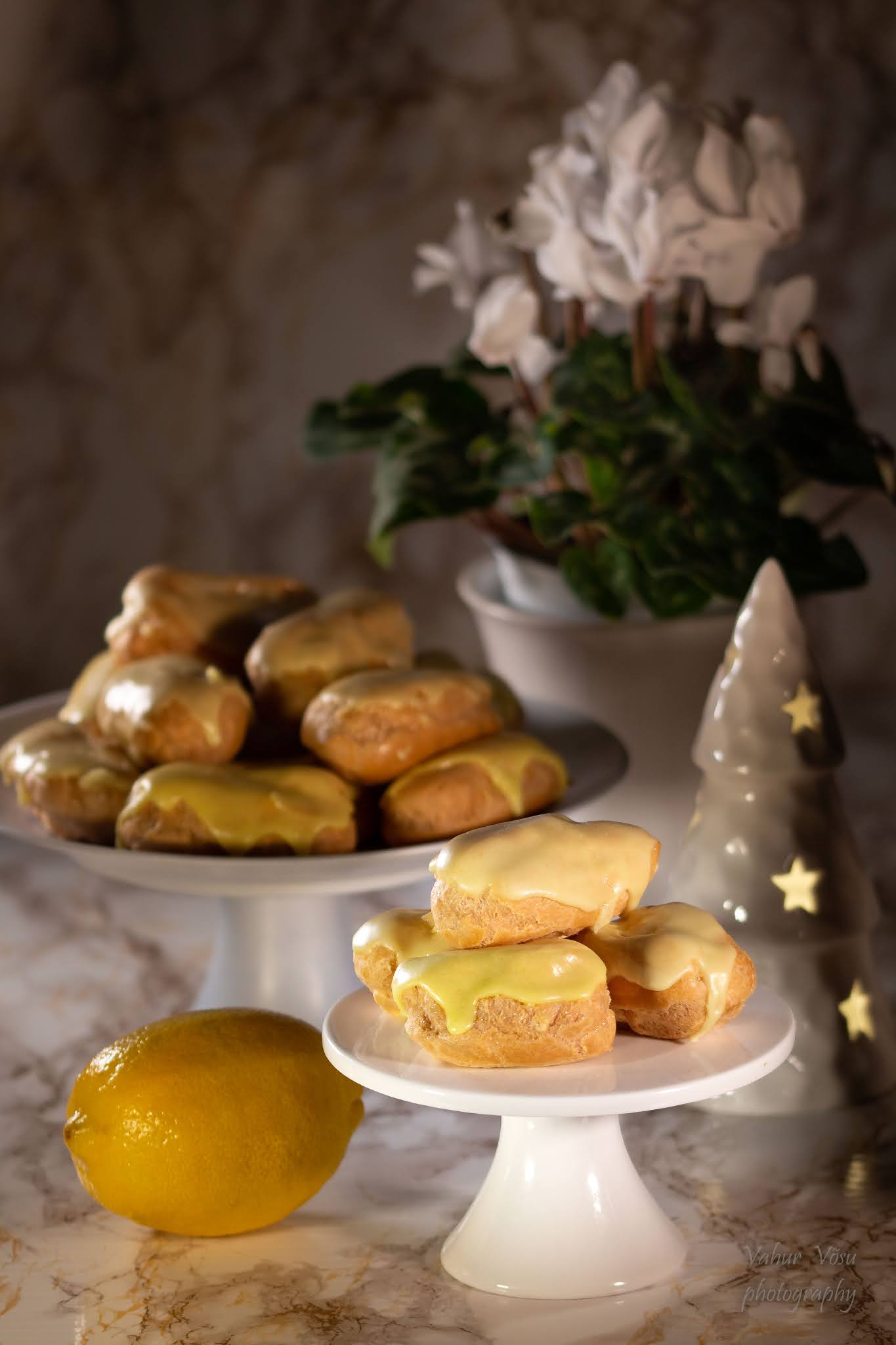 Sõelu tuhksuhkur kaussi ja lisa sidrunimahl ning toiduvärv. Hõõru glasuur ühtlaseks. Pane glasuur pritskotti ja kaunista ekleerid glasuuriga.