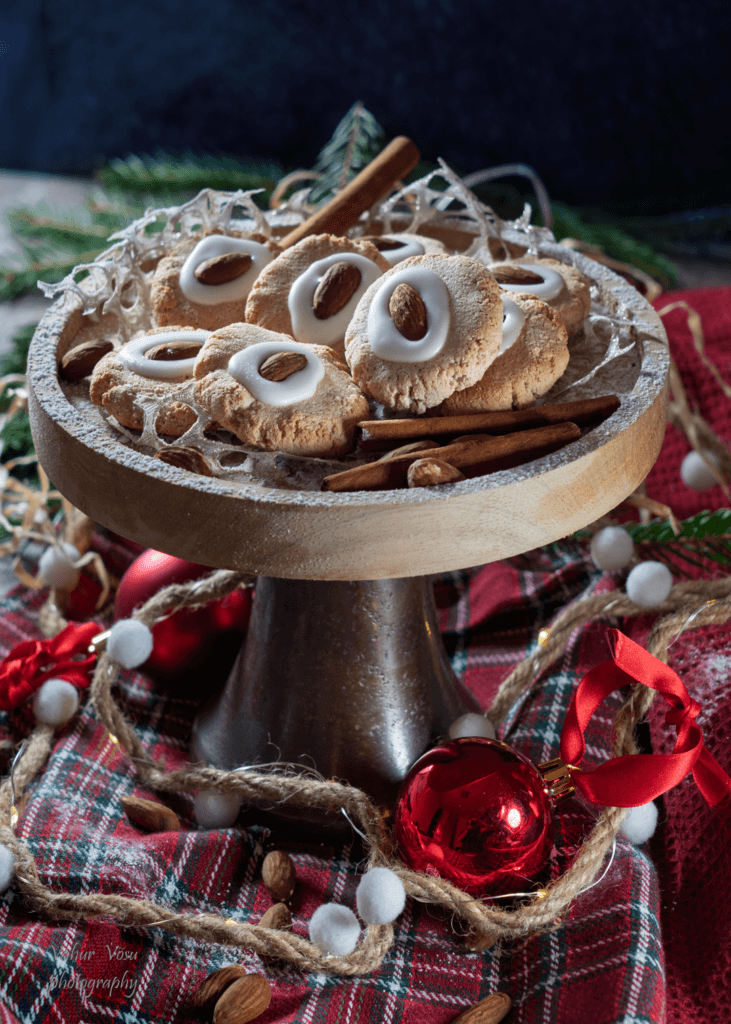 Vahusta munavalged soolaga tugevaks vahuks. Lisa 150 g tuhksuhkrut ning vahusta veel kuni saad tugeva vahu. Lisa kaneel, sidrunimahl ja mandlijahu ning sega kuni saad ühtlase taigna. Lase taignal toatemperatuuril seista ca 30 minutit, et tainas kuivaks ja seda oleks lihtsam käsitleda.