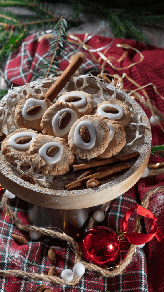 Kaalu taignast ca 20 g tükikesed ning veereta neist ümmargused pallikesed. Pane pallikesed küpsetuspaberiga kaetud ahjuplaadile ning vajuta pallikesed käega lamedaks. Pane iga küpsise keskele terve mandel. Lase küpsistel kaks tundi õhu käes kuivada enne küpsetamist.
