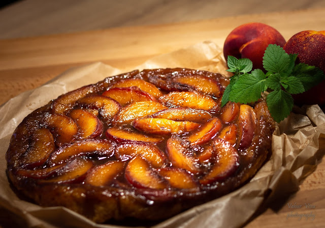 Kata virsikud lehttaignaga ja suru taigna servad virsikute ja panni ääre vahele- nii, et vedelik ei pääseks taigna peale.