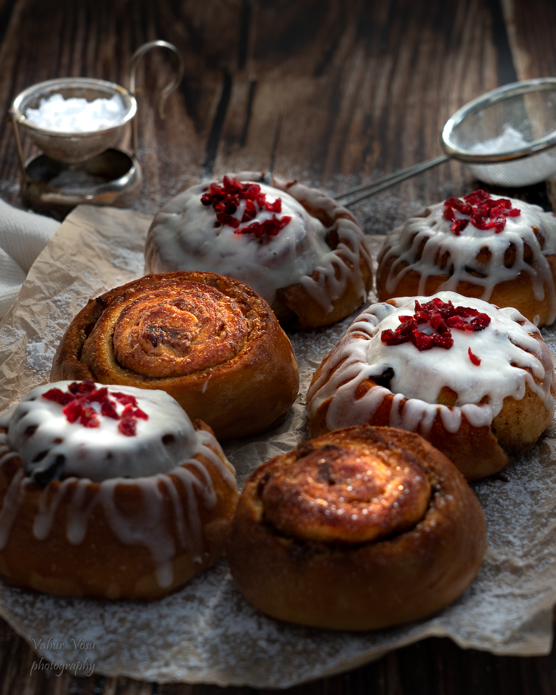 Toorjuustuglasuuriga rullsaiad piparkoogivürtside ja kuivatatud jõhvikatega