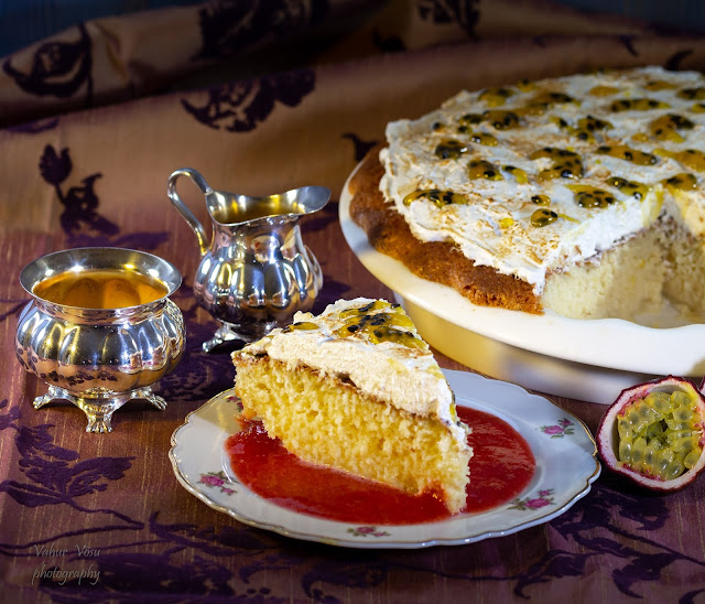Serveeri koos koogiga. Koogile võid värvi andmiseks lisada ka suhkruga keedetud passioniviljasiirupit koos seemnetega. Lisaks kõrvetasin koogi pinda ka gaasipõletiga, et anda koogile pisut pidulikum välimus. 😊