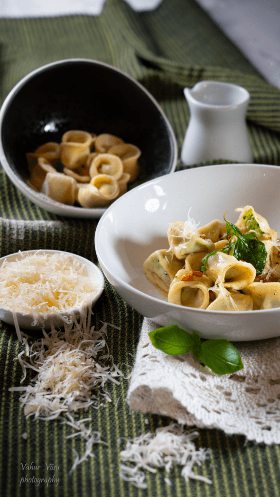 Vormi tortelliinid (kasuta ringide väljalõikamiseks 6 cm läbimõõduga küpsiselõikurit) ja keeda neid soolaga maitsestatud vees ca 5 minutit. Kui soovid suuremaid tortellinisid võid kasutada ka suurema läbimõõduga küpsiselõikurit. Serveeri tortelliinid koos võikastme, riivitud juustu ja röstitud basiilikulehtedega. Soovi korral võid lisada serveerimisel ka pisut sidrunikoort.