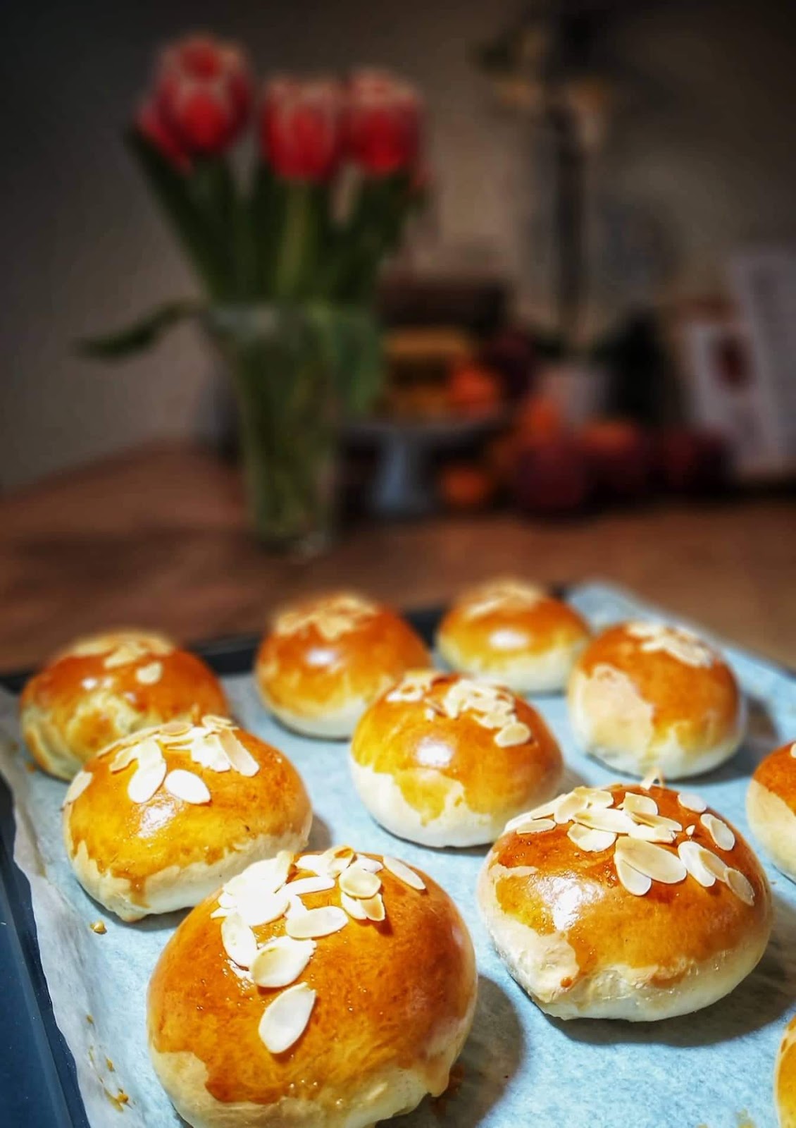 Laota kerkinud taigen jahuga kaetud lauale ning suru taignast õhk välja. Jaga taigen 12-ks võrdseks osaks ja rullu pallideks. Kata pallid rätikuga ning jäta need 30-45 minutiks kerkima.
